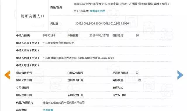 廣東某食品貿易公司于今年5月提交了第30類“隱形窮人”一詞的注冊申請。目前,該商標正在等待實質審查。