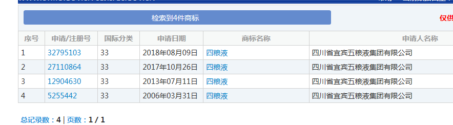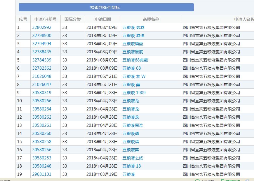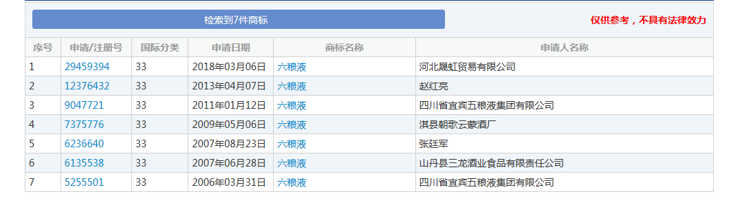 前兩天,邊肖在中國商標局官網查詢。結果她驚喜地發現“六糧液”,而且已經進入初審公告期。在查詢33種白酒商標時,檢索到以下7條信息,均注冊為“六糧液”商標。只有兩條信息顯示“六糧液”商標的申請人為五糧液集團,其余均為他人申請。