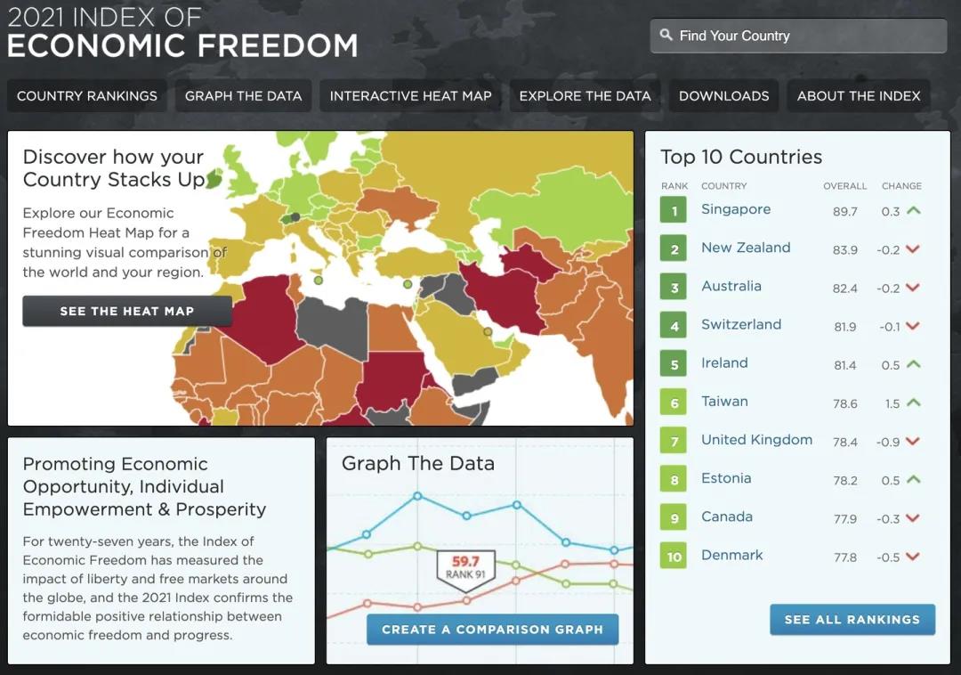 新加坡的經濟自由度名列前茅,尤其是在國際貿易自由度、貨幣政策和政府監管方面。