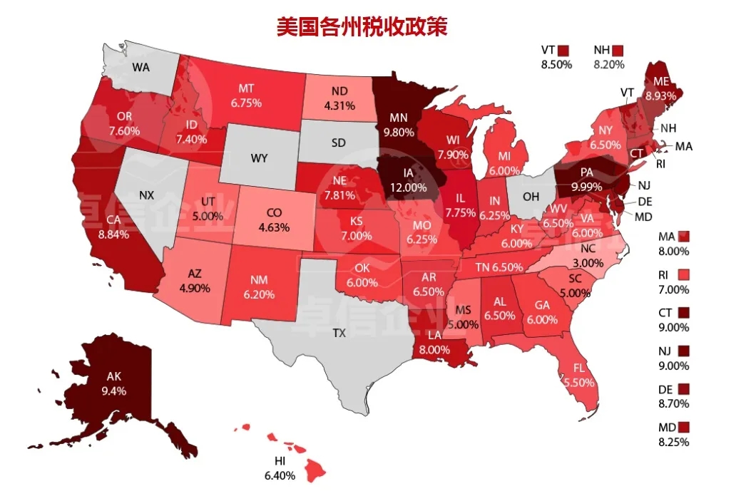 美國有50個州。出于政策原因,每個州對企業(yè)的稅率都不一樣。所以在注冊美國公司的時候,選擇合適的辦公地點,對于合理節(jié)稅會有很大的幫助。